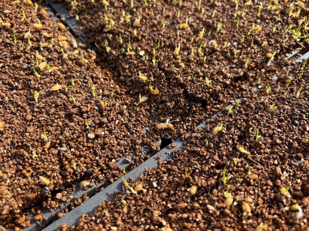 種まきして3日目、稲が芽吹いてきました。全体的に土が盛り上がってきて、次の下の命が膨らんでいるのが分かります。