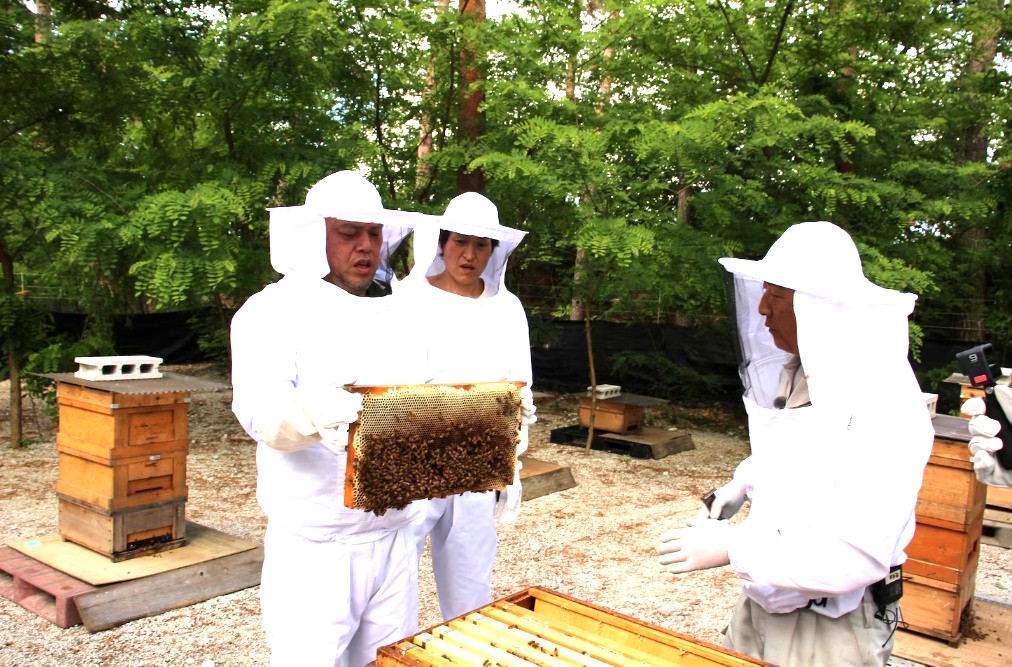 このたびシェラリゾートホテルの料理にわがミツバチ園の蜂蜜を使っていただけることになり、雨降りのこの日ミツバチ園へ視察に来られました。濵野総料理長補佐もご一緒で、補佐にはラヴィーニュ白馬時代にもお世話になり、今回ご縁を結んでいただきました。