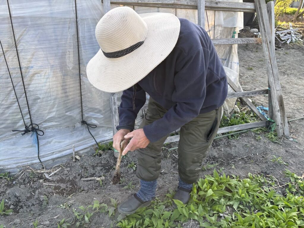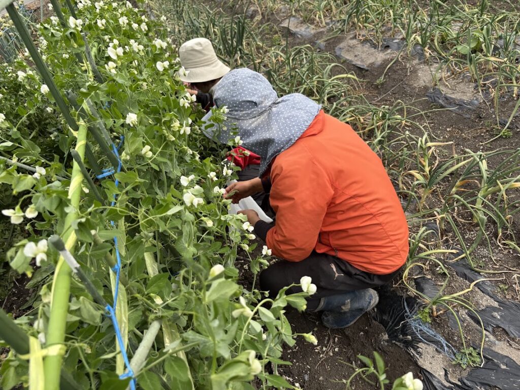 私も妻も仕事でお世話になったご縁の小林さん。かつてのスキーの仲間。この日は手入れの行き届いた農園へお邪魔させていただきました。まだ早いと言いながらもエンドウや菜の花、玉ねぎなどをいただきました。
